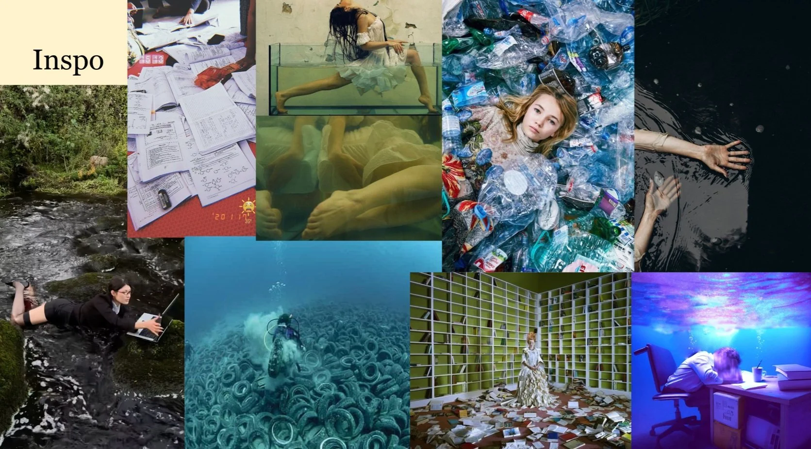 Drowning our model “in” something, but also “in” the water. Paperwork. Beauty supplies, clothing, OVERCONSUMPTION